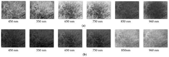 Taking winter pasture #1 as an example, Figure 10 and Figure 11 are a group of multispectral images from ASQ-Discover, which were captured on winter pasture #1 in May 2018. There were fresh grass, hay grass, and soil in these multispectral images.