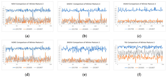 In order to compare the six vegetation indices’ values (NDVI, OSAVI, GNDVI, NDRE, BNDVI, and TGI) for the same pasture at different times, 200 quadrats were randomly, selected in August 2017, May 2018, and July 2018 of winter pasture #2. The means of the six vegetation indices were computed and are shown in Figure 8. The VI values were normalized in order to compare them. The natural growth cycle of grassland on the Qinghai plateau was divided into four stages, such as the re-greening phase (April–June), the grass-bearing phase (July–September), the yellowing phase (October–December), and the dry grass phase (January–March). The VI values in August 2017 are higher than those in May 2018 and July 2018, and the VI values in July 2018 are closer to those in May 2018. In other words, the grassland vegetation exhibited better growing trends in August 2017.