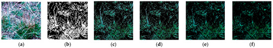 The threshold determination of the ExG − ExR method for extracting fresh grass. (a) The multispectral image (with 450 nm, 550 nm, 650 nm). (b) Hand-generated template image. (c) Threshold = 0, accuracy = 0.9363. (d) Threshold = 0.05, accuracy = 0.8139. (e) Threshold = 0.1, accuracy = 0.7025. (f) Threshold = 0.2, accuracy = 0.5157.
