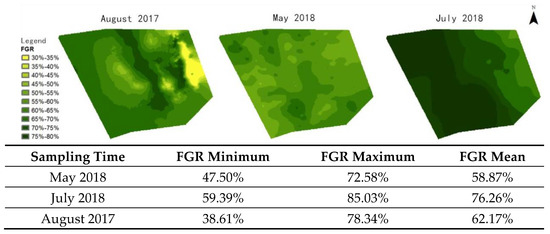In this study, the research pastures are flat, and the sampling distance between quadrats is about 20 m. The classical Bayesian Kriging interpolation algorithm was used to produce an FGR map of the whole pasture (in Figure 12), and the statistics were given in Figure 12. The FGR values in July 2018 are higher than those in May 2018 and August 2017, while the FGR values in August 2017 are closer to those in July 2018 than those in May 2018.