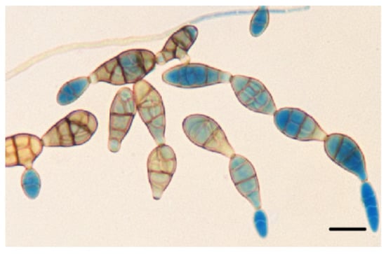 Spores of Alternaria alternata isolate P 11. Spore specimens were prepared with the sell tape technique and stained with lactophenol blue solution (Fluka) (scale bar = 10 μm).