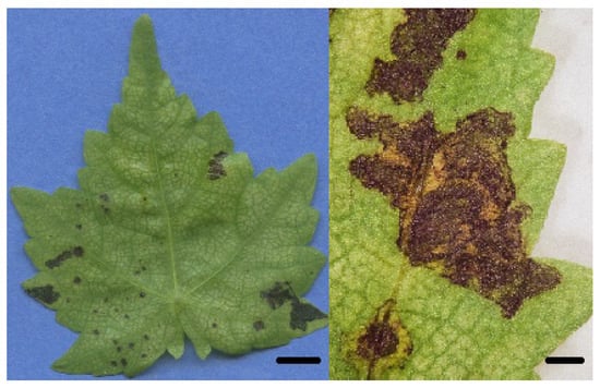 Necrotic changes on Virginia fanpetals leaves in Koch’s test (right, scale bar = 2 cm) viewed under a stereo microscope (right, scale bar = 2 mm).