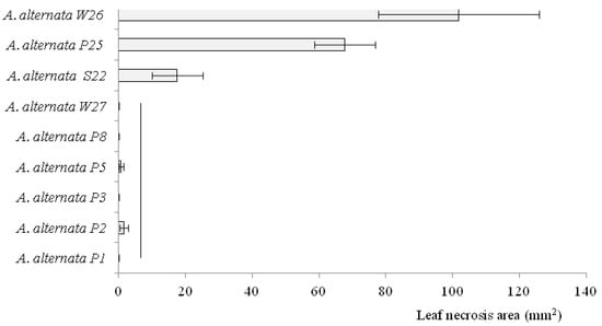 Pathogenicity of Alternaria alternata isolates in the detached leaf bioassay. Means followed by the same letter do not differ significantly in Fisher’s LSD test at p < 0.05.