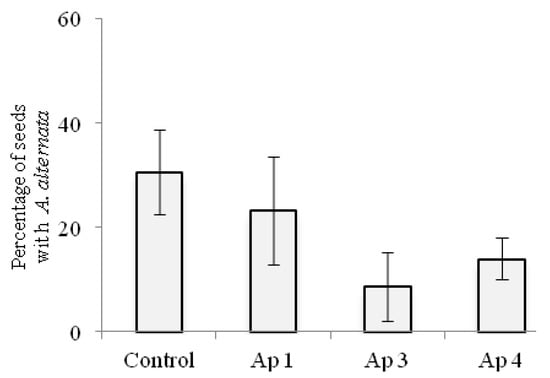 Percentage of Sida hermaphrodita seeds colonized by Alternaria alternata after treatment in vitro by Aureobasidium pullulans isolates Ap 1, Ap 3 and Ap 4.