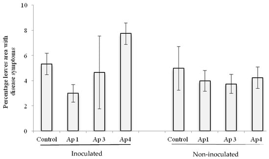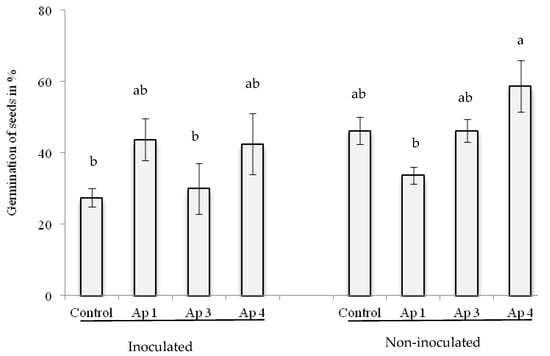 In comparison with non-dressed control seeds, all A. pullulans isolates inhibited the growth of A. alternata on dressed seeds in vitro (Figure 5). Aureobasidium pullulans isolate Ap 3 was most effective in reducing the number of seeds infected with A. alternata. The presence of A. alternata colonies was observed on only 8.67% of the seeds dressed with a suspension of A. pullulans isolate Ap 3. In contrast, A. alternata colonized 30.68% of non-dressed control seeds. All antagonistic isolates limited disease symptoms in plants grown from non-inoculated seeds in the greenhouse (Figure 6). Aureobasidium pullulans isolate Ap 1 was most effective in reducing leaf area infected with A. alternata, by up to 43.72% in comparison with inoculated control seedlings. Additionally, in the greenhouse experiment, all isolates enhanced the germination capacity of inoculated seeds (Figure 7). In the greenhouse experiment, A. pullulans isolates Ap 1 and Ap 4 were particularly effective in minimizing the adverse effects of seed inoculation with A. alternata. The application of these isolates increased seed germination by around 60% relative to the inoculated control.