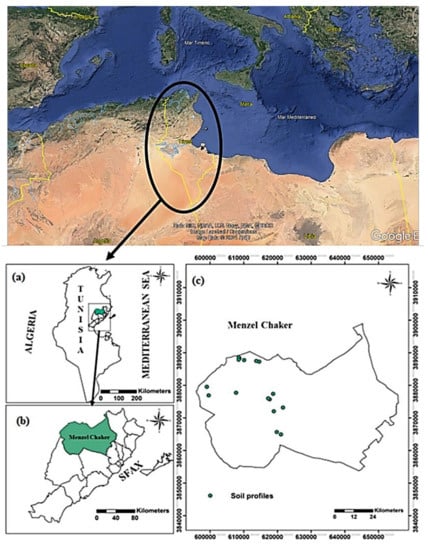 Maps of the study area: (a) Tunisia map, (b) Sfax location, and (c) Menzel-Chaker district with the location of soil profiles https://earth.google.com/web/@36.6638314,7.9704552,553.33197981a,3949044.97759938d,35y,0h,0t,0r (Google Earth Pro—Access: 27 September 2021).