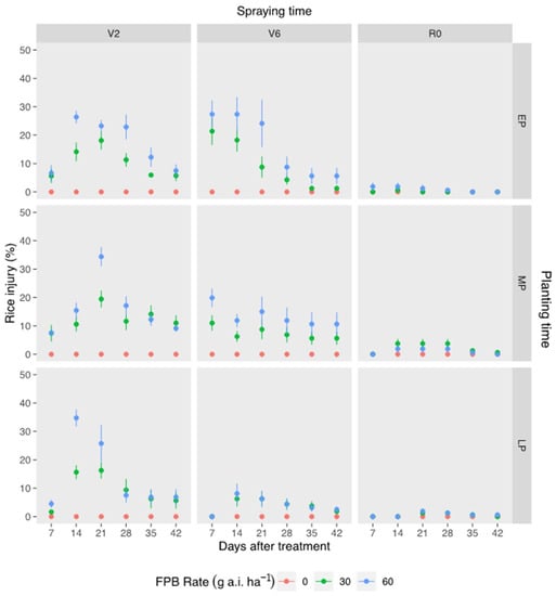 Rice crop injury as affected by planting time and florpyrauxifen-benzyl (FPB) application time and rate. Average of two growing seasons (2019/20 and 2020/21). EP: early planting time (30 September 2019/25 September 2020), MP: medium planting time (25 October 2019/20 October 2020), and LP: late planting time (11 November 2019/10 November 2020). Growth stage at spraying time, when 50% of crop reached V2: collar formation on leaf two on the main stem; V6: collar formation on leaf six on the main stem; R0: Panicle development has initiated. Confidence interval at 95% (n = 8).