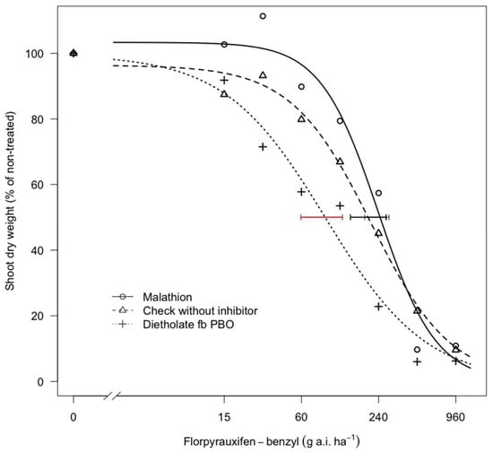 Based on the confidence interval of GR50 calculated from the dry shoot weight collected at 28 DAA, there was a significant difference between the check without inhibitor and with dietholate followed by PBO inhibitor, whereas for the treatment with malathion, it did not show a difference (Figure 2). The dietholate followed by PBO showed the lowest GR50 with a 63% inhibition ratio compared to FPB without the inhibitor; however, as observed with ED50, the dose to reach GR50 was 2.9-fold times the recommended label rate (89.6 g ai ha−1) (Table 2).