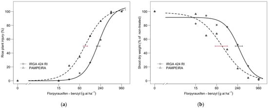 Rice cultivar BRS Pampeira and IRGA 424 RI response to florpyrauxifen-benzyl doses to (a) plant injury and (b) shoot dry weight relative to the non-treated check. The confidential interval was estimated at 50% of plant injury and growth reduction, respectively. Means over experimental runs (n = 6).