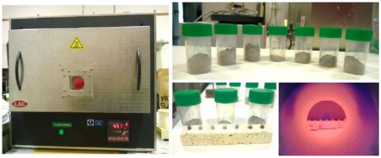 The ash melting behavior of the RS with and without additives was determined according to the ČSN P CEN/TS 15370-1:2007 [53] standard by measuring its characteristic temperatures of ash melting within a laboratory analysis. The method used is an empirical test based on direct observation. The prepared ash (at 550 °C) was mixed with additives (CaCO3 and Ca(OH)2) in the above-mentioned ratios, as well as one pure ash sample (without additives), which was used for the production of test samples for comparison. The test samples (cylinders of 3 mm to 5 mm height and with a diameter equal to the height) were made by hand press with spring pressure compression. These test samples were heated up in the muffle furnace LAC with peephole (model LH 06/13, Rajhrad, Czech Republic) from 550 °C, with a constantly increasing rate of 10 °C min−1, and their shape was continuously observed. An illustration of the device used in the experiment and the test samples is presented in Figure 1.