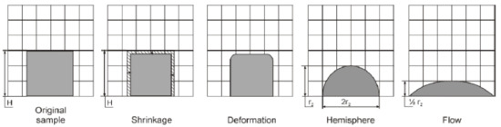 Shrinkage temperature (ST) represents the temperature at which the test sample area is reduced below 95% of the original sample area. Deformation temperature (DT) is the temperature at which the first sign of edge rounding of the sample occurs due to melting. Hemisphere temperature (HT) corresponds to the temperature at which the sample forms approximately a hemisphere with a height equal to half of the base diameter. Flow temperature (FT) represents the temperature at which the ash flows over the supporting tile in a layer, with a height half of that for the sample in the previous hemisphere temperature [53].