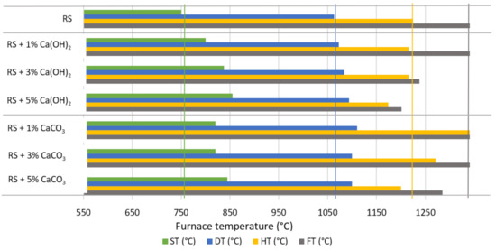 Regarding the studies incorporating calcium additives, Schmitt and Kaltschmitt [24] proved that 1 and 2 wt.% of Ca(OH)2 help to enhance the ash melting temperature of the biomass of wheat straw and wood, and reported that if the proportion of Ca(OH)2 was doubled, the sinter degree was halved. On the other hand, the present research showed the enhancing impact of Ca(OH)2 just in certain stages of ash melting behavior—shrinkage and deformation stage (compare with pure RS, see Figure 2). A similar trend was observed by Shen and Zheng [63], who reported temperature enhancements of RS ash mixed with approximately 6% CaCO3 by 220 °C and 240 °C for ST and DT, respectively, and a slight temperature decrease for HT and FT.