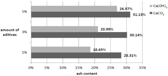 It is also important to mention that the addition of an additive increases the total ash content (see Figure 4). According to the research findings, the test materials with CaCO3 demonstrated a higher content of ash than Ca(OH)2 samples, and, as expected, a higher additive concentration resulted in a higher ash content. Compared to the pure RS, 5% CaCO3 increased the ash content by almost double. The higher ash content increase in the sample than in the additive could be caused by the fact that the particular additive and its concentration absorbed some substances that otherwise could end up in burnt gases [68]. For future research, a calculation formula of Toscano et al. [67] can be used as a useful tool to predict the possible ash content of biomass mixed with additive and to control it with a proper dosage of additive. Altogether, the amount of additive to be used is a function of the biomass type and may depend on its ash content [67,69]. Some degree of variability must be taken into account when considering laboratory- and pilot-scale tests, as the homogeneity and accuracy in the addition of the additive can differ and can bring variable responses [67].