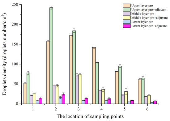 The effect of aviation spray adjuvant on droplet density and deposition in different layers of wheat canopy.