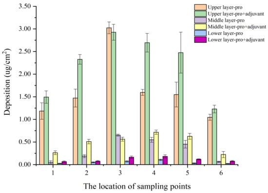 The droplet density of prothioconazole 30% OD with the spray adjuvant in the wheat canopy (65.23~242.30 droplets cm−2 for the upper layer, 22.10~74.90 droplets cm−2 for the middle layer, and 7.50~24.70 droplets cm−2 for the lower layer) was significantly higher than that of no adjuvant (51.97~172.40 droplets cm−2 for the upper layer, 18.30~70.70 droplets cm−2 for the middle layer and 3.90~15.90 droplets cm−2 for the lower layer) (Table 2 and Figure 3). The deposition amount of pesticide in the wheat canopy (1.23~2.93 μg cm−2 for the upper layer, 0.22~0.72 μg cm−2 for the middle layer, and 0.07~0.16 μg cm−2 for the lower layer) was mostly higher than that of no adjuvant added (1.05~3.02 μg cm−2 for the upper layer, 0.06~0.65 μg cm−2 for the middle layer, and 0.02~0.11 μg cm−2 for the lower layer) (Table 2 and Figure 4).