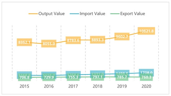 Many countries in the world have announced several relief plans to reduce the impact of the pandemic on agri-food enterprises [12,13]. However, many government relief policies are not enough to completely make up for the loss of agri-food product sales caused by the COVID-19 pandemic [14]. Understanding the specific impact of the pandemic on agri-food product sales and the revenue of agri-food enterprises, and how to minimize the impact has become a top priority. Figure 1 shows the output value, import value and export value of China’s agri-food products from 2015 to 2020. Taking 2020 as an example, the National Bureau of Statistics of China [15] reported that the output value of China’s agri-food products in 2020 was USD 1082.18 billion. According to statistics from the Department of International Cooperation of the Ministry of Agriculture [16], the total export value of agri-food products was USD 76.03 billion, and the total import value of agri-food products was USD 178.0 billion. It can be seen from Figure 1 that in recent years, the Chinese population’s consumption of agricultural products has shown an increasing trend year by year, from USD 881.41 billion in 2015 to USD 1176.95 billion in 2020, an increase of 33.53% in six years. Given the importance of agri-food products, we use the translog model to study how the pandemic affects agri-food product sales from the perspective of corporate financial statements. Furthermore, we propose policy options to assist the recovery of agricultural food sales from the effects caused by COVID-19. The demand is today overwhelmingly urgent. Our research found that the COVID-19 pandemic has reduced the sales of agri-food products, and moreover that the sales of agri-food products by large agricultural companies have fallen more than those of small and medium-sized ones.