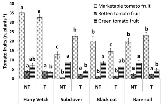 The numbers of marketable, rotten and green tomato fruits were generally affected by all main effects (p < 0.05) and by the interaction between cover crop and soil tillage (p < 0.01). The marketable fruit was higher in 2015 compared to the 2014 tomato growing season (25.2 vs. 20.2 n. plant−1, respectively) and in hairy vetch compared to the other cover crop treatments (on average, 34.0 vs. 18.9 plant−1, respectively, Table 2). Although soil tillage, as the main effect, was not significant (p > 0.05), there was an interaction between cover crop and soil tillage (Figure 1). Marketable tomato fruit amounts were similar in hairy vetch and bare soil regardless of soil tillage, while in subclover it was higher in tilled soil than no tilled soil; conversely, in black oat it was higher in NT compared to T treatments (Figure 1). As expected, the number of marketable tomato fruit was higher in N150, intermediate in N75 and lower in N0 (Table 2). The weight of marketable fruit per plant followed a similar trend, except for cover crop treatments, where it was the highest in hairy vetch followed by bare soil, while it was the lowest in subclover and black oat (on average, 257.7, 178.3, and 130.9 g of DM plant−1, respectively).