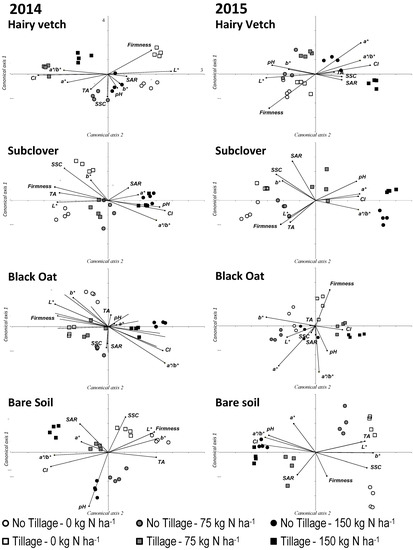 In hairy vetch, the first two canonical variables generally accounted for approximately 76% and 61% of the total variance in the 2014 and 2015 tomato growing seasons, respectively. In both years, firmness and L* seemed to be associated with N0 regardless of soil tillage, while TA in 2014 was associated with N75 and in 2015 with N150. a*, a*/b* and CI vectors were in the same orientation space as the N75 and N150 fertilization level, while SAR and SSC seemed to be associated with N150, especially in the 2015 growing season (Figure 2). In subclover, the first two canonical variables explained 69% and 55% of the total variance in the 2014 and 2015 tomato growing seasons, respectively. Generally, Firmness and TA were associated with N0, especially in NT soil management, while pH, CI, a*/b*, a*, SAR were in the same orientation space of N150 regardless of soil tillage (Figure 2). In black oat, the total variance explained by the first two canonical variables was 67% and 62% in 2014 and 2015 tomato growing seasons, respectively. Generally, pH, a*, a*/b*, and CI vectors were in the same orientation of N150 fertilization level regardless of soil tillage; this trend was particularly evident in the 2014 growing season, while SAR seemed to be associated with N75 fertilization, especially in bare soil and black oat (Figure 2). Conversely, b* seemed to be associated with no-tillage N0, while firmness was in the same orientation space as tillage N0. In bare soil, the first two canonical variables explained 76 and 68% of the total variance in the 2014 and 2015 tomato growing seasons, respectively. In both years, CI, a*/b*, SAR and a* vectors were generally associated with tillage N150, while pH was associated with no-tillage N150, especially in 2014. The other vectors seemed to be associated with N0, with a certain level of differentiation between soil tillage, especially in the 2015 tomato growing season (Figure 2). In both years, there was a strong correlation among the different quality parameters measured for marketable tomato fruits (Table 7).