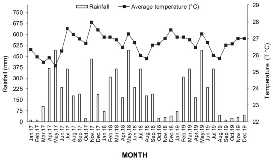 Month mean temperatures and rainfall from January 2017 through December 2019 in the experimental area in Orellana Province.