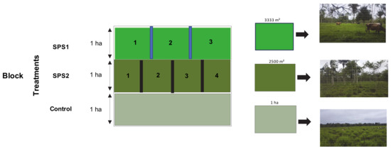 SPS1 was divided into three paddocks of 3333 m2 using permanent electrical wires. SPS2 was divided into four paddocks of 2500 m2 by mobile electrical wires. By contrast, the Control treatment was not divided to simulate a conventional system with guinea grass as a monoculture (Figure 2).