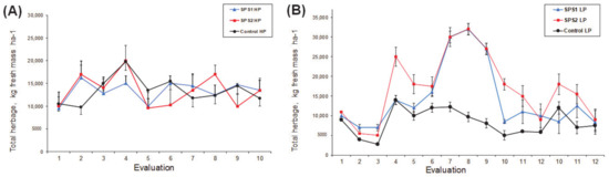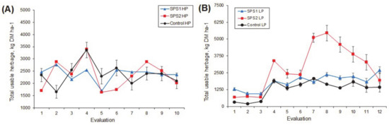 Consequently, when fresh mass production (kg ha−1) was analyzed, no significant differences were found between treatments (p > 0.05), but it was lower in the Control group in comparison with SPS1 and SPS2, which had similar fresh masses (14,493 and 15,146 kg ha−1, respectively), as shown in Table 1. However, there were statistical tendencies that reflected seasonal effects (p = 0.089), with higher fresh mass values (kg ha−1) in the dry season (from September to January) for all treatments, as shown in Figure 3. Therefore, we observed differences (p < 0.05) in DM (kg ha−1) due to the varying seasons: DM was higher in the LP season than in the HP season (5712 ± 1036 vs. 3694 ± 951 kg ha−1, respectively). Moreover, a slight tendency was associated with the interaction between treatment and season (T × S; Table 1).