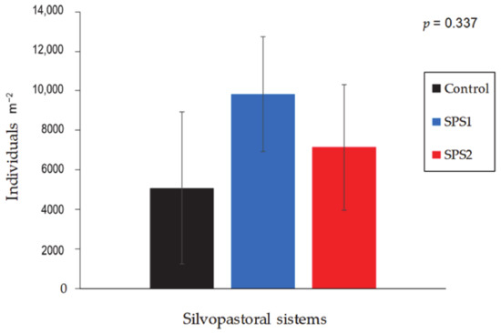 The soil macrofauna was not statistically affected by treatment, season, or their interaction (p > 0.05; Figure 5). However, more individuals (per m−2) were detected in the SPS1 and SPS2 silvopastoral systems than in the Control.