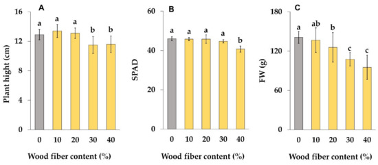 Main effect of waste wood fiber substrates and additional fertilization with nitrogen on (A) plant height, (B) leaf greenness index (SPAD), and (C) fresh weight of the above-ground part (FW) of interspecific geraniums. Data are mean ± SD. Different letters above the error bars indicate significant differences for p ≤ 0.05.