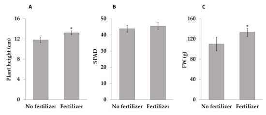 Main effect of additional fertilization with nitrogen on (A) plant height, (B) leaf greenness index (SPAD), and (C) fresh weight of the above-ground part of interspecific geraniums. Data are mean ± SD. * above the error bars indicate significant differences for p ≤ 0.05.