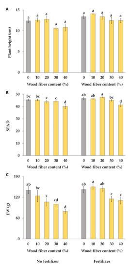 Plant height, leaf greenness index, and fresh weight of the above-ground part depended both on the type of substrate (Figure 1A–C) and additional fertilization (Figure 2A–C). The height of the plants grown in 100% peat substrate (control) was similar to that of plants grown in peat and 10% and 20% of waste wood fiber. When the wood fiber content was 30% or 40%, the plants were significantly (p ≤ 0.05) lower than the control ones. Leaf greenness index in the plants cultivated in 100% peat reached 46 ± 1.01 SPAD and was similar to that in plants grown in peat enriched with 10% (46 ± 0.79 SPAD), 20% (46 ± 2.16 SPAD), and 30% (45 ± 0.86 SPAD) of wood fiber. However, when the ratio of wood fiber was 40%, the leaf greenness index decreased to 41 ± 1.56 SPAD. The highest fresh weight of the above-ground part was found in the control plants grown in peat-only substrate (141 ± 9.16 g). Supplementing the peat with 10%, 20%, 30%, or 40% of wood fiber reduced fresh weight of the above-ground part almost linearly by 3%, 11%, 24%, or 33%, respectively.