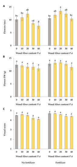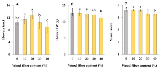 Main effect of waste wood fiber substrates on (A) number of flowers (B) fresh weight (FW) of flower, and (C) visual score of interspecific geraniums. Data are mean ± SD. Different letters above the error bars indicate significant differences for p ≤ 0.05.