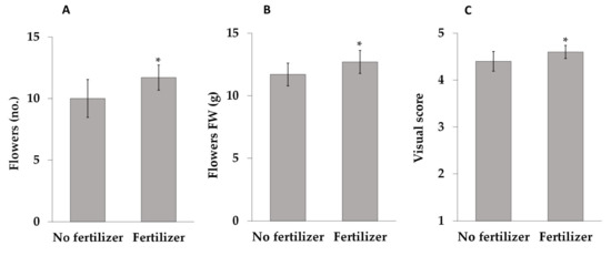 Irrespective of the substrate type, the additionally fertilized plants produced a significantly (p ≤ 0.05) greater number of flowers per plant (by 17%), and had greater fresh weight of flower (by 9%) and visual score (by 5%) in comparison with non-fertilized plants (Figure 6A–C).