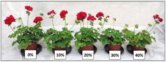Geraniums belong to the most important ornamental plants in the world, and are the leading commodity on the flower exchanges [1]. They are resistant to unfavorable environmental conditions and widely used in urban areas in flower beds, containers, and green areas [2,3]. Moreover, geraniums are natural accumulators of heavy metals and, as such, can be used for phytoremediation [4]. To maintain consumer interest and increase the sales of geraniums, breeding companies constantly seek new cultivars with distinctive decorative features, such as interspecific geraniums developed by crossing the two most important geranium species: Pelargonium × hederaefolium, syn. P. peltatum and P. × hortorum, syn. P. zonale. The new hybrids show some of the most desirable functional and morphological traits of P. × hederaefolium (resistance to high temperature, large, dark-green leaves, sizable inflorescences) combined with the advantages of P. × hortorum (abundant flowering, possibility of cultivation in hanging containers) [5]. A particularly attractive group of interspecific geraniums is Calliope developed by Syngenta/FloriPro Service company with cultivars characterized by vigorous growth, overhanging habit, and high disease resistance [6]. The guidelines for growing popular geranium species are well developed [7], but studies on potted plant production of interspecific geraniums are lacking.