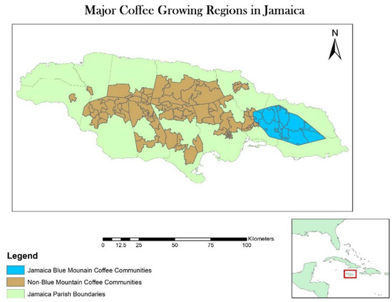 Most coffee farms are located above 300 m on soils rich in organic material. The famous JBM coffee is grown in the Blue Mountains located in eastern Jamaica. With a maximum height of 2256 m, the range covers over 750 km2. JBM coffee is grown at elevations ranging from a low of 550 m up to 1600 m, with the best beans growing between 1100 and 1600 m. At these elevations, the higher quality Coffea arabica thrives; the berries mature more slowly and produce a drink with more delicate flavors than those grown at lower elevations. As a result, production is concentrated in the JBM region [15]. According to the Jamaica Agricultural Regulatory Authority (JACRA), about 80% of the island’s 5000 farmers are found in the Blue Mountains of eastern Jamaica. A smaller concentration exists in central Jamaica, and the balance is scattered throughout the hills of the island. The area outside of the Blue Mountain region is formally marketed as the Jamaica High Mountain region. However, for the purposes of this research paper, all areas outside of the JBM will be referred to as the non-Blue Mountain (NBM) region.