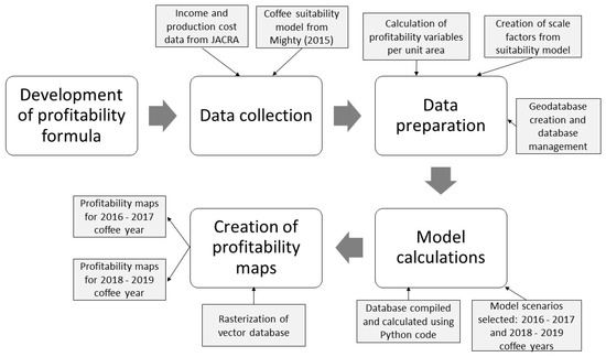 The result of this research has implications for production and management decisions in the coffee industry around the world. Small farmers who do not have the luxury of large economies of scale can use the results of this research to be ‘nimbler’ and make informed decisions more readily by examining the potential profitability of their lands. This research also highlights the contribution of exogenous factors such as farmgate prices vs. endogenous factors such as land suitability and production methods to farm profitability, even in an agricultural commodity that commands a significantly higher market price. Finally, the model discussed here is designed in such a way to facilitate a ‘plug and play’ functionality to predict potential profitability. Not only does this make it more accessible to stakeholders with variable technological capacities, but it provides an avenue for modification and use on various geospatial software platforms—a real benefit for entities with limited access to or funding for more expensive geospatial software.