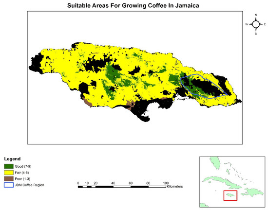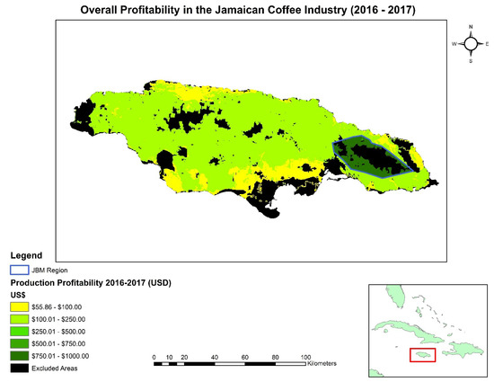After obtaining the variables needed to calculate profitability, they were formatted for use for the model. All values recalculated to align with the areal unit/measure being used and costs were kept in their values of Jamaican dollars until final results were calculated. The yield scale and production cost scale factors were created from the suitability model. These scale factors were used as a proxy for actual yield monitors that one would find in advanced agricultural enterprises [35] (p. 386). In consultation with extension officers at JACRA, the suitability model was first divided into three groups and then a scale factor applied to each group. It was recommended that 5% would be an appropriate scaling factor to use for this model [38]. As noted in Table 1 above, coffee yields and production costs were adjusted as follows: areas rated 7–9 were assumed to obtain maximum yield and incur base level production costs; areas rated 4–6 saw a 5% decrease in yields and a 5% increase in production costs; and areas rated 1–3 saw a 10% decrease in yields and a 10% increase in production costs.