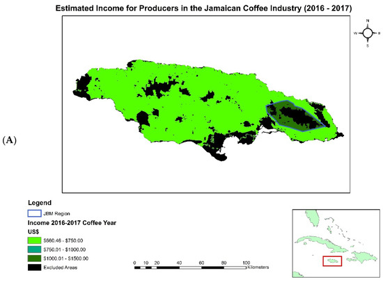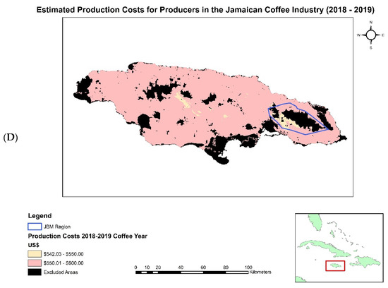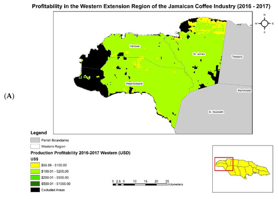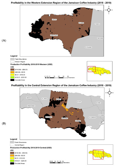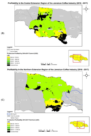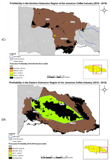 (A–D) showcase profitability in the island of Jamaica by the four coffee extension regions (western, central, northern, and eastern) for the 2016–2017 coffee year.