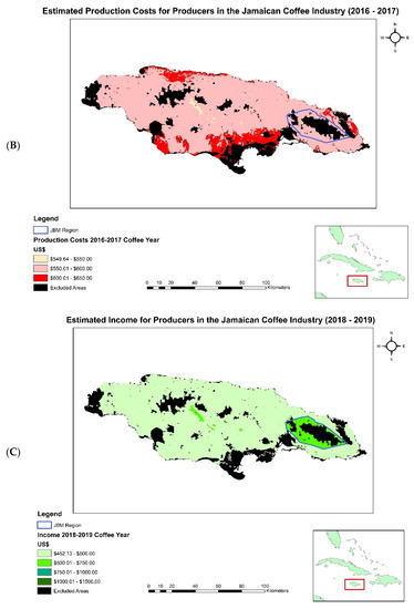 (A–D): Calculated income and production costs for the island of Jamaica for the 2016–2017 and 2018–2019 coffee years.
