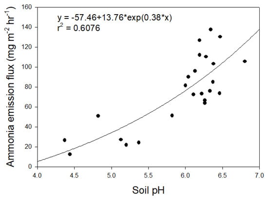 The NH3 emission trend is highest immediately after application of the LF and showed a tendency to decrease gradually over time [12]. Therefore, in this study, the emitted NH3 per unit area was calculated by collecting the NH3 emitted during the initial hour, with the highest emitted flow rate after LF was applied to the soil. As a result, as the soil pH increases, the NH3 emission flux tends to increase (Figure 2). Although a total of 24 soils were treated with the same fertilizer at the same ratio, the emission flux values show a wide range, from a minimum of 12.38 mg m−2 h−1 to a maximum of 137.35 mg m−2 h−1. In a study conducted under the same conditions using granite weathered soil (GWS) rather than agricultural soil, an emission flux was calculated as 115.34 mg m−2 h−1 [12]. At that time, the pH of GWS was 6.9 and the LOI was 0.8%. In this study, the highest pH among the investigated soils is 6.80, the highest LOI is 5.0%, and the emission flux is calculated as 105.52 mg m−2 h−1. It is judged that the large difference in organic matter does not have a significant effect on the NH3 emission flux. On the other hand, while soil pH increases from 4.44 to 6.47, the NH3 emission flux increases more than ten times, from 12.38 mg m−2 h−1 to 130.27 mg m−2 h−1. The volatilization of NH4+ into NH3 is based on Henry’s constant at the surface of liquid and gas and proceeds by diffusion, and volatilization is promoted as the pH of the solution increases [21]. Considering that the NH3 emission flux is 855.5 mg m−2 h−1 when only LF is put in the chamber without any solid medium [12], soil media appears to play a role in reducing NH3 volatilization. Since the ability to buffer the effect of increasing the pH of the soil–LF mixed medium improves as the pH of the soil is lowered, it is considered that the lower the soil pH, the more effectively the NH3 emission flux is decreased. In the end, the results indicate that the characteristics of fertilizer and compost/LF are important in the volatilization of nitrogen originating from fertilizer to NH3, but it is also greatly influenced by the characteristics of the agricultural soil that is applied. Not only soil pH, but also CEC and infiltration depth are known to be factors that significantly affect NH3 volatilization [22]; however, in this study, the effect of pH is very high and the CEC difference between soils is not significant. Due to the characteristics of the chamber experiment, it is difficult to confirm a significant effect because there is no difference in the penetration depth.