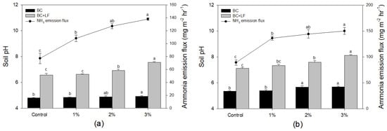 After the LF was applied, and the amount of NH3 emitted for an hour was calculated, the pH of the soil was also measured. As a result, the pH of the soil significantly increased in all soils and BC treatments (Figure 3). Looking at the extent of the increase in soil pH, in the case of soil (Figure 3a), the soil pH increases from 4.80 to 6.57 when the LF is applied, but when the BC is treated at the level of 3%, the soil pH during LF treatment is 4.92 to 7.54 compared to the control, indicating a greater pH increase. This trend can be confirmed in the same manner in soil (Figure 3b), suggesting that the effect of increasing soil pH by simultaneous treatment of LF and BC is immediate, and that they affect each other. In the early stages of treatment, the effect of increasing soil pH is much greater with LF treatment rather than that of BC. However, the rapid increase in soil pH due to LF treatment is due to the supply of a high concentration of NH3, which is a general phenomenon that occurs during LF treatment [10], and it then returns to its original state through the infiltration and nitrification process [24]. Nevertheless, the temporary synergistic effect of increasing pH when BC and LF are simultaneously treated will need to be observed with interest in the future. As the soil pH increased significantly due to the simultaneous treatment of BC and LF, an increase in the NH3 emission flux from the LF is expected. NH3 emission flux is increased in both soils (Figure 3). In the case of soil (a), the NH3 emission flux increased as the BC treatment increased, showing 77.22 mg m−2 h−1 in the control and 138.14 mg m−2 h−1 in the 3% treatment. In the case of soil (b), the NH3 emission flux increased as the BC treatment increased, with 89.01 mg m−2 h−1 in the control and 150.32 mg m−2 h−1 in the 3% treatment. Sha et al. [25] performed a meta-analysis based on 144 observations from 41 references, and the effect of reducing NH3 volatilization by BC treatment proceeds only under very limited conditions. It was reported that NH3 volatilization increased by BC application. On the other hand, Mandal et al. [26] announced the results of a reduction in volatilization of NH3 by up to 70% when urea, ammonium phosphate, and poultry fertilizer were added to five types of soil and demonstrated that the adsorption, immobilization, and nitrification of NH4+ are significant mechanisms of the reduction in NH3 volatilization by BC. Subsequently, Mandal et al. [27] reported an increase in wheat growth as NH3 volatilization decreased to around 40%, and nitrogen loss decreased when BC was treated up to 2% in pH 7.8 soil. In summary, NH3 volatilization and emission reduction in soil by BC proceeds under some restrictive conditions, and NH3 volatilization is determined by the complex action of the liming effect among the properties of BC and nitrogen fertilizers as well as soil pH [25].