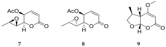 The 6-substituted derivatives of 5,6-dihydropyran-2-ones (or 5,6-dihydro-α-pyrones) are polyketides produced by microorganisms and plants [36,37]. These compounds are characterized by the presence of an α, β unsaturated-δ-lactone, with an alkyl, alkenyl or aryl substituent at C-6 and occasionally a varied substitution pattern around the ring. Many of these products are biologically active, exhibiting phytotoxicity, cytotoxicity against tumor cells and antifungal or antimicrobial activity [36,37].