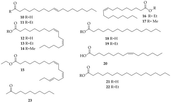 Structures of fatty acids: elaidic acid, ethyl elaidate, linoleic acid, ethyl linoleate, methyl linoleate, 9,12,15-octadecatrienoate ethyl ester, ethyl oleate, methyl oleate, palmitic acid, methyl palmitate, palmitoleic acid, stearic acid, ethyl stearate, undecan-2-one (10–23).