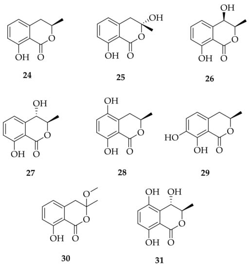 Structures of melleins: (R)-(−)-mellein, (R)-(−)-3-hydroxymellein, (3R,4R)-(−)-4-hydroxymellein, (3R,4S)-(−)-4-hydroxymellein, (3R)-5-hydroxymellein, 7-hydroxymellein, (±)-botryoisocoumarin A, (+)-neoisocoumarin (24–31).