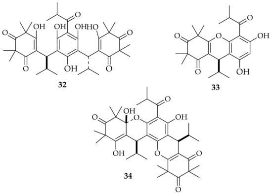 Myrtucommulone A (32) is the founding product of the group of structurally related compounds named myrtucommulones whose structures are characterized by a phloroglucinol nucleus coupled with syncarpic acid residues (Figure 5) [28]. Myrtucommulones and related acylphloroglucinols are frequently reported as products of plant species belonging to the family Myrtaceae (e.g., Eucalyptus globulus [43], Kunzea ericoides [44], Myrtus communis [45,46,47], Melaleuca citrina [48], Rhodomyrtus tomentosa [49,50,51]) spread in the Australasian region and these compounds are well-known for their antimicrobial, antioxidant and anti-inflammatory activities [28]. Some endophytic fungi from the genus Neofusicoccum are able to produce myrtucommulones. This finding represents a new frontier in the study of myrtucommulones because the availability of strains to be cultured in vitro may provide access to increased amounts of these products for further investigations. To date, myrtucommulones A, B and D (32–34) were identified in cultures of endophytic strains of N. australe of myrtle (Myrtus communis) [27,28]. Antiproliferative activity effects on the human prostatic cancer cell lines DU145 and PC3 were observed for a mixture of 32 and 34 [27].