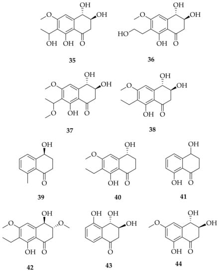 Structures of naphthalenones: botryosphaerones A–D, isosclerone, O-methylasparvenone, O-methylaspmenone, (3R,4R)-3-methoxyl-botryosphaerone D, 3,4,5-trihydroxy-1-tetralone, (3S,4S)-3,4,8-trihydroxy-6-methoxy-3,4-dihydro-1(2H)-naphthalenone (35–44).