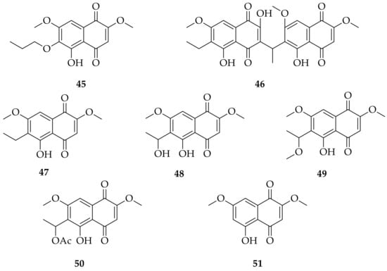 Seven naphthoquinones have been isolated from Neofusicoccum species (Figure 7). The most significant structural differences are the presence of hydroxyl, methoxyl, alkyl or acetate groups in different positions on the 1,4-naphthalenoid ring, but these compounds share the hydroxy group at C-5 and the methoxy groups at C-2 and C-7. These groups are all present in the 5-hydroxy-2,7-dimethoxynaphthalene-1,4-dione (50) [25], which was identified as a product of an endophytic strain of B. australis (=N. australe) isolated from the mangrove plant Avicennia marina, together with botryosphaenin (45), a new naphtoquinone. This latter compound and its 6-ethyl analogue (6-ethyl-5-hydroxy-2,7-dimethoxynaphthalene-1,4-dione 47) showed antibiotic and antiproliferative activities with a minimum inhibitory concentration (MIC) ranging from 2 to 32 μg mL−1 when tested on Gram-positive bacteria and an IC50 value from 0.5 to 2 μg mL−1 when tested on different cell lines [25].