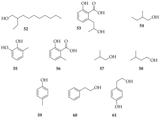 Structures of phenols and alcohols: 2-ethyldecan-1-ol, 2-hydroxypropyl salicylic acid, 2-methylbutan-1-ol, 3-methylcatechol, 6-methyl-salicylic acid, isobutanol, isopentyl alcohol, p-cresol, phenylethyl alcohol, tyrosol (52–61).