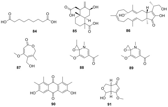 A number of products of Neofusicoccum species are placed in a miscellaneous category (Figure 10) because they have no structural affinity with previous groups. This is the case of luteoethanones A and B (88–89), two phytotoxic 1-substituted ethanones, identified for the first time from the culture extract of N. luteum [18].