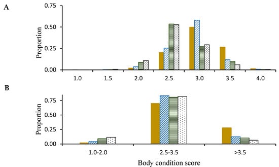 Distribution of ewe body condition scores by stage of the annual cycle from 18,354 individual records of 5761 ewes during their fourth year (43–54 months) of age. Bar colors (grey, yellow, blue and green) indicate BCS proportions at pre-breeding, pregnancy diagnosis, pre-lambing and weaning respectively. In (A), a BCS of 1–4-point scale was used and in (B), 1–3 scale (BCS 1.0–2.0: 1, 2.5–3.5: 2 and >3.5: 3).