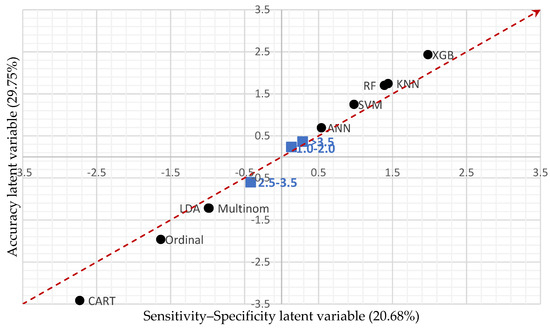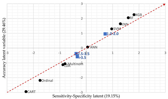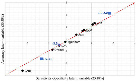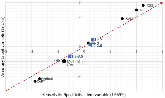 A plot of the accuracy and sensitivity–specificity latent variables from their first dimension/component obtained through a factor analysis of mixed variables (a combination of principle component and multiple correspondence analyses) procedure on measures of performance for the prediction of ewe BCS during pregnancy diagnosis. Dots (red sphere: model, blue square: BCS class). Dotted diagonal line indicates a balance between accuracy and sensitivity–specificity. If dot is above, then model or BCS class was more accurate than sensitive–specific while the reverse indicates that the model was more sensitive than accurate. The further and more positive a model is along the diagonal line, the greater and better is its prediction power. The variance explained by each extracted first dimension for each latent variable (accuracy, sensitivity–specificity) is given in parenthesis along the axes.