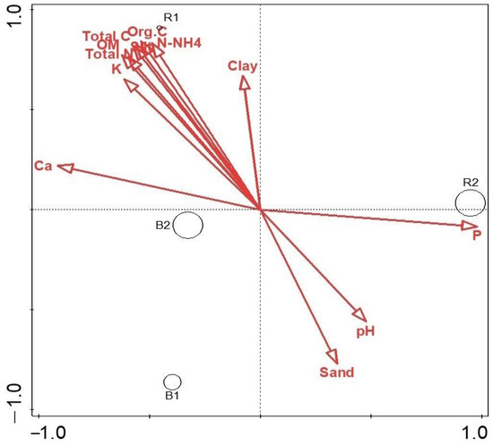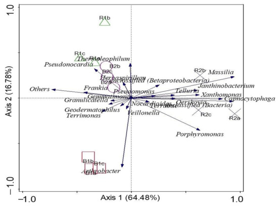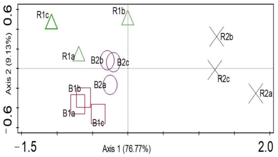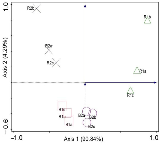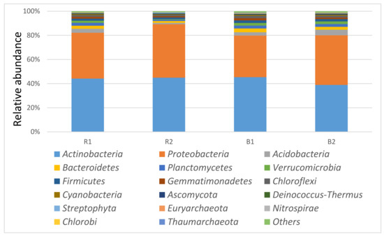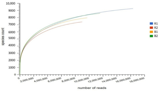 3.4. Microbial Community Diversity Richness and Evenness of Sunflower Rhizosphere R1, R2, and Bulk Soils B1, B2 Examined